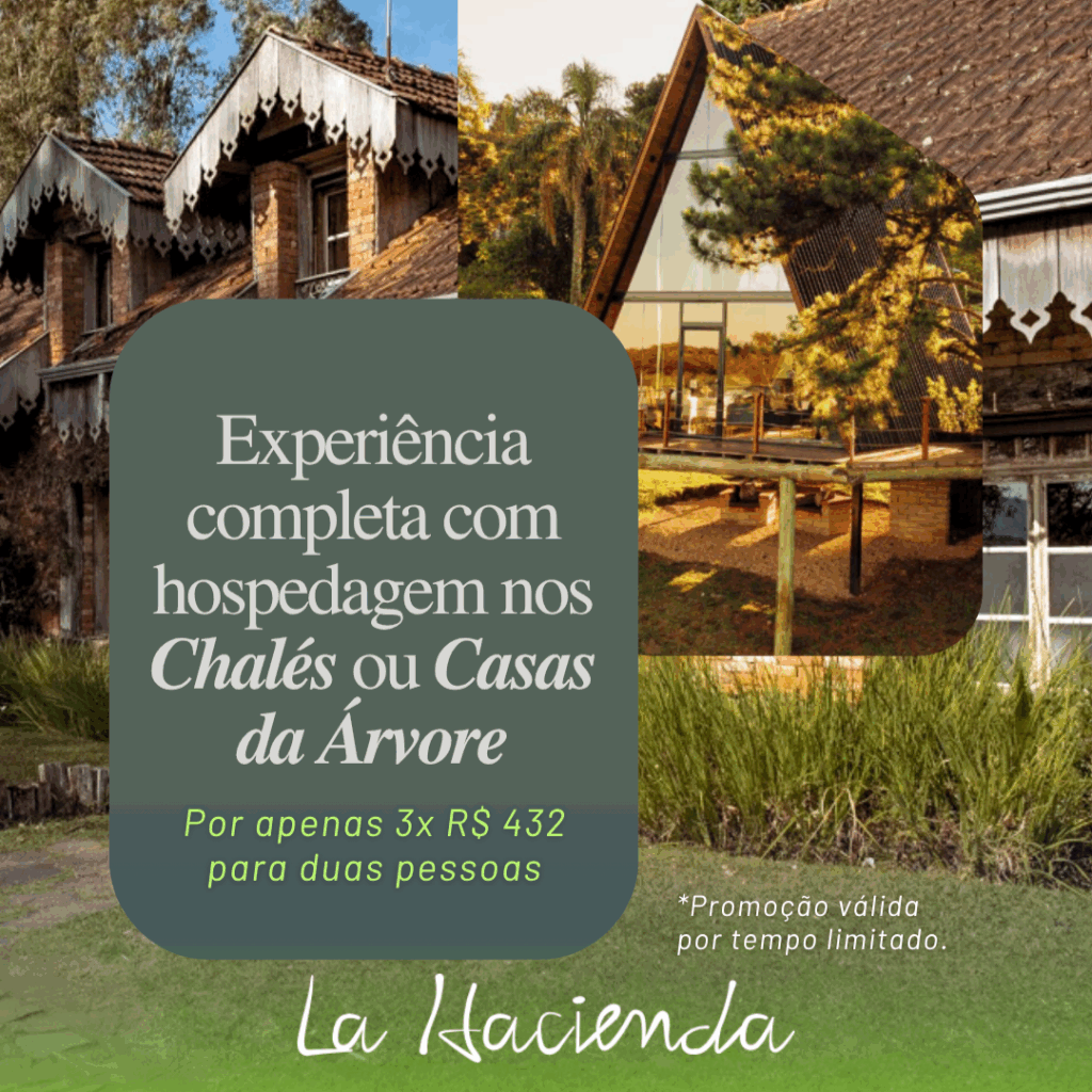 Tudo isso por apenas 3x de R$432 para duas pessoas, com Hospedagem de Charme nos Chalés ou Casas da Árvore da La Hacienda.